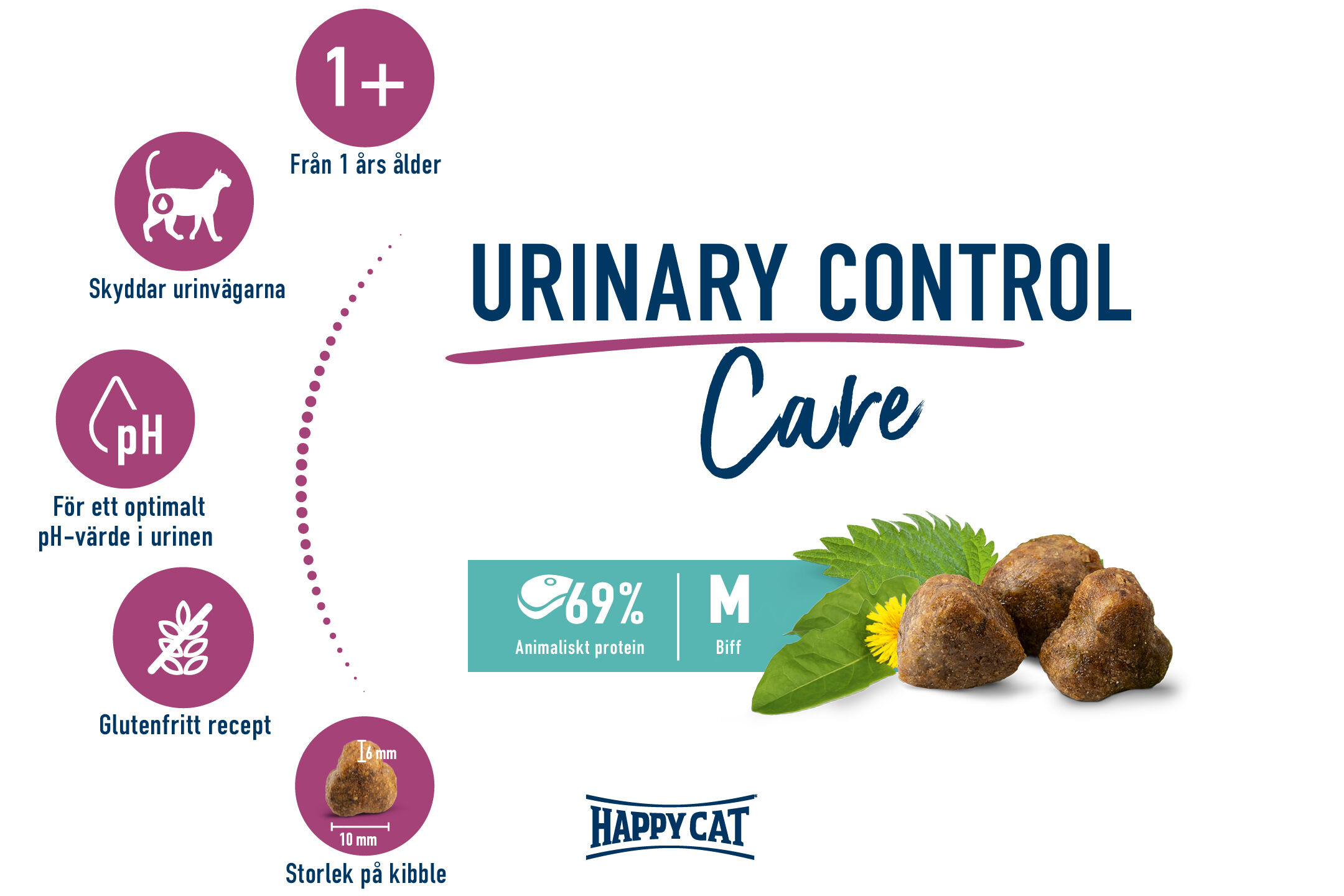 Receptet för Happy Cat Care Urinary Control är speciellt utvecklat av våra näringsexperter för katter med känsliga urinvägar som är benägna att få urinvägsproblem. Den ökade metioninhalten (som gör urinen surare) skyddar din katts urinvägar, samtidigt som den reducerade halten av mineraler så som kalcium, fosfor och magnesium i fodret ger extra stöd för känsliga urinvägar.