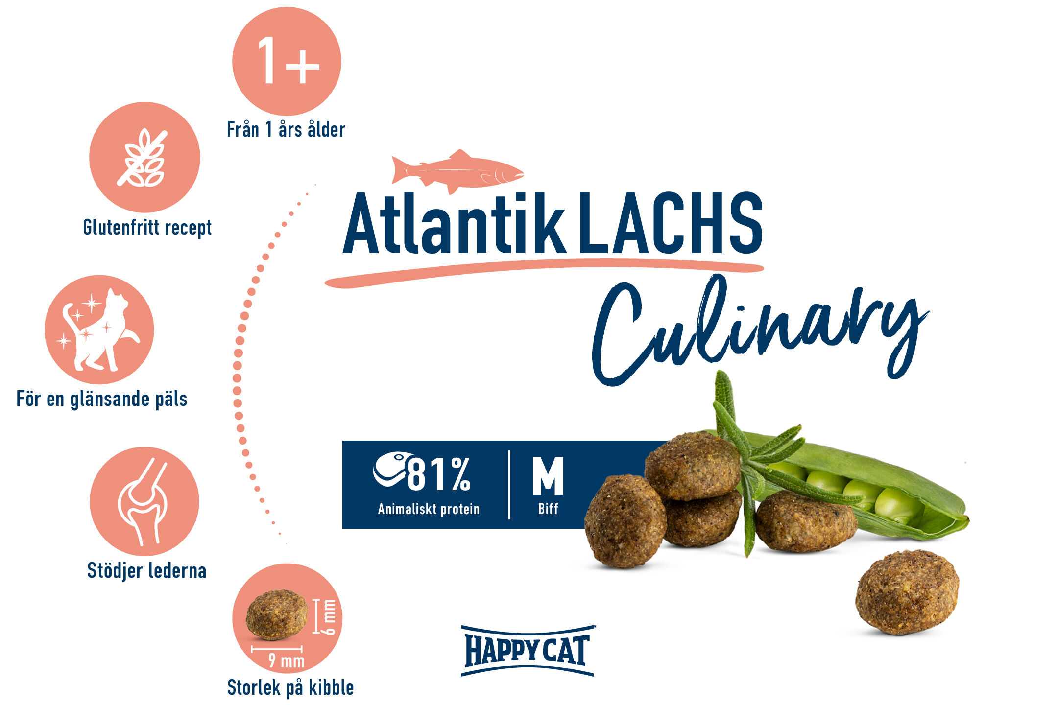 Happy Cat Atlantic-Lax erbjuder din kattvän en balanserad och naturlig diet. Skäm bort din katt med lätt tolererad lax, läckra ärtor och delikat rosmarin. Den höga råfiberhalten bidrar till att minimera hårbollar. Den finaste laxen levererar värdefulla omega 3 och 6 fettsyror och är den perfekta grunden för att säkerställa att din katt har ett hälsosamt liv fullt av vitalitet. Lederna stöds naturligtvis av tillsats av grönläppad nyazeeländsk mussla. De lättsmältbara kexen är också lämpliga för aktiva katter.