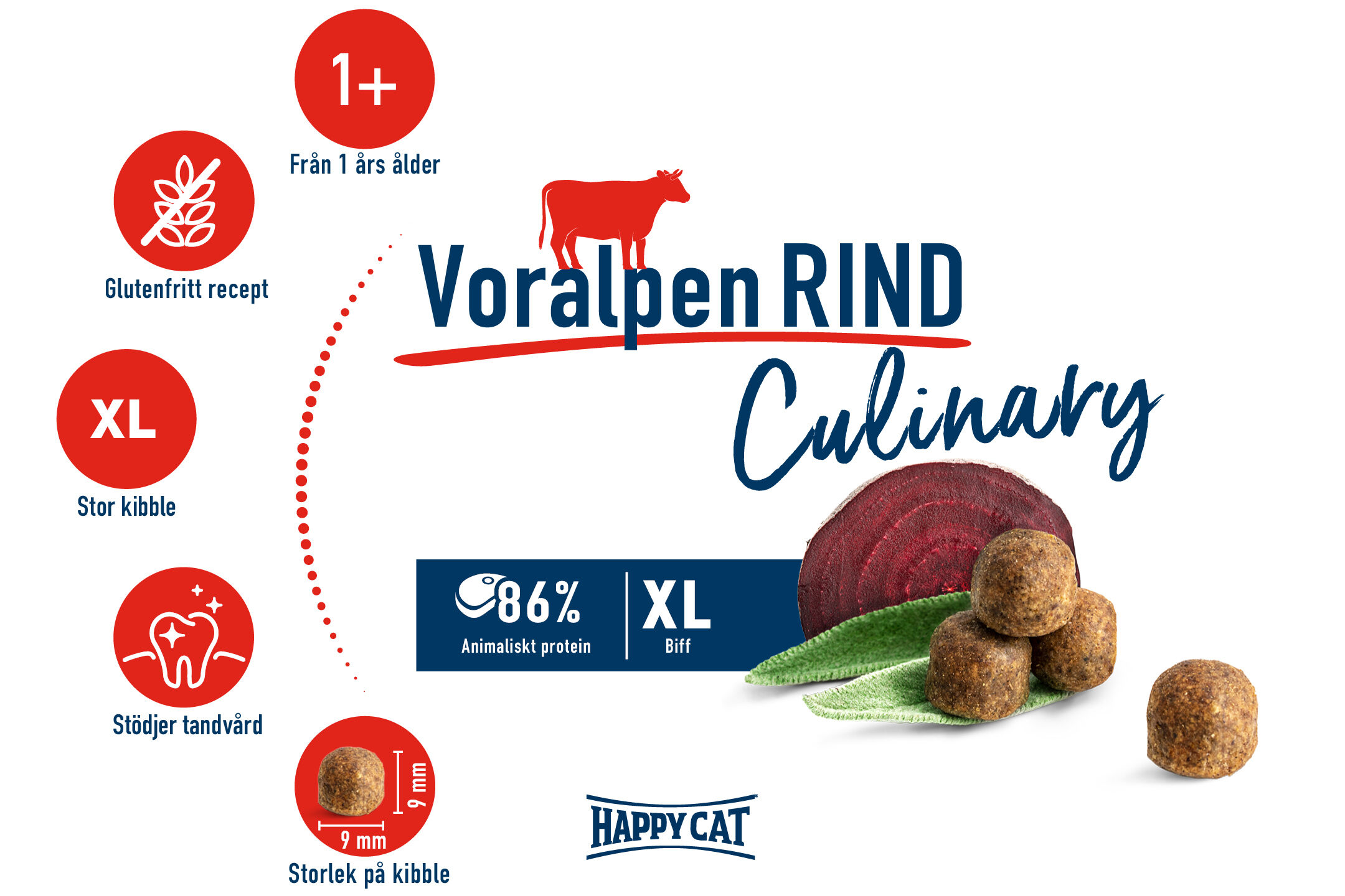 Köttmjöl (totalt 19 %, varav 75 % köttmjöl från nöt), fågelprotein*, majs, majsmjöl, oljor och fetter, ris potatis*, animaliskt protein (inklusive nötprotein 2 %), hydrolyserat protein*, lignocellulosa, hemoglobin*, betmassa* (avsockrad), kaliumklorid, torkade hela ägg, äppelpressmassa* (0,4%), jäst*, natriumklorid, morot*, tång*, cikoriapulver (0,15 % = 0,1 % inulin), linfrö (0,15 %), flingade ärtor, rödbetspulver (0,1 %), musselkött* (0,05 %), mjölktistel, jäst* (extrakt, 0,02 % = 0,0032 % mannan oligosackarider), kronärtskocka, maskros, ingefära, björklöv, nässla, kamomill, koriander, rosmarin, salvia (0,008 %), lakritsrot, timjan (totalt torkade örter: 0,16 %)