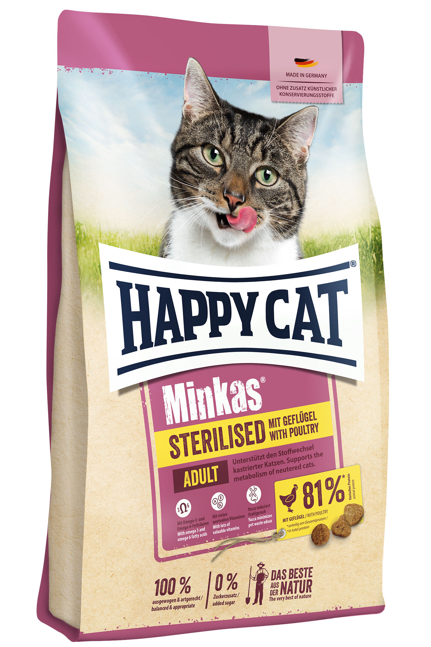 Sammansättningen av vårt torrfoder Happy Cat Minkas Sterilised Fågel är anpassad efter behoven hos kastrerade katter, vars ämnesomsättning förändras i samband med kastreringen. Det balanserade helfodret har ett reducerat fettinnehåll och hjälper därmed din katt att hålla vikten. Tack vare de mättande fibrerna i fodret blir din katt ändå nöjd och mätt.