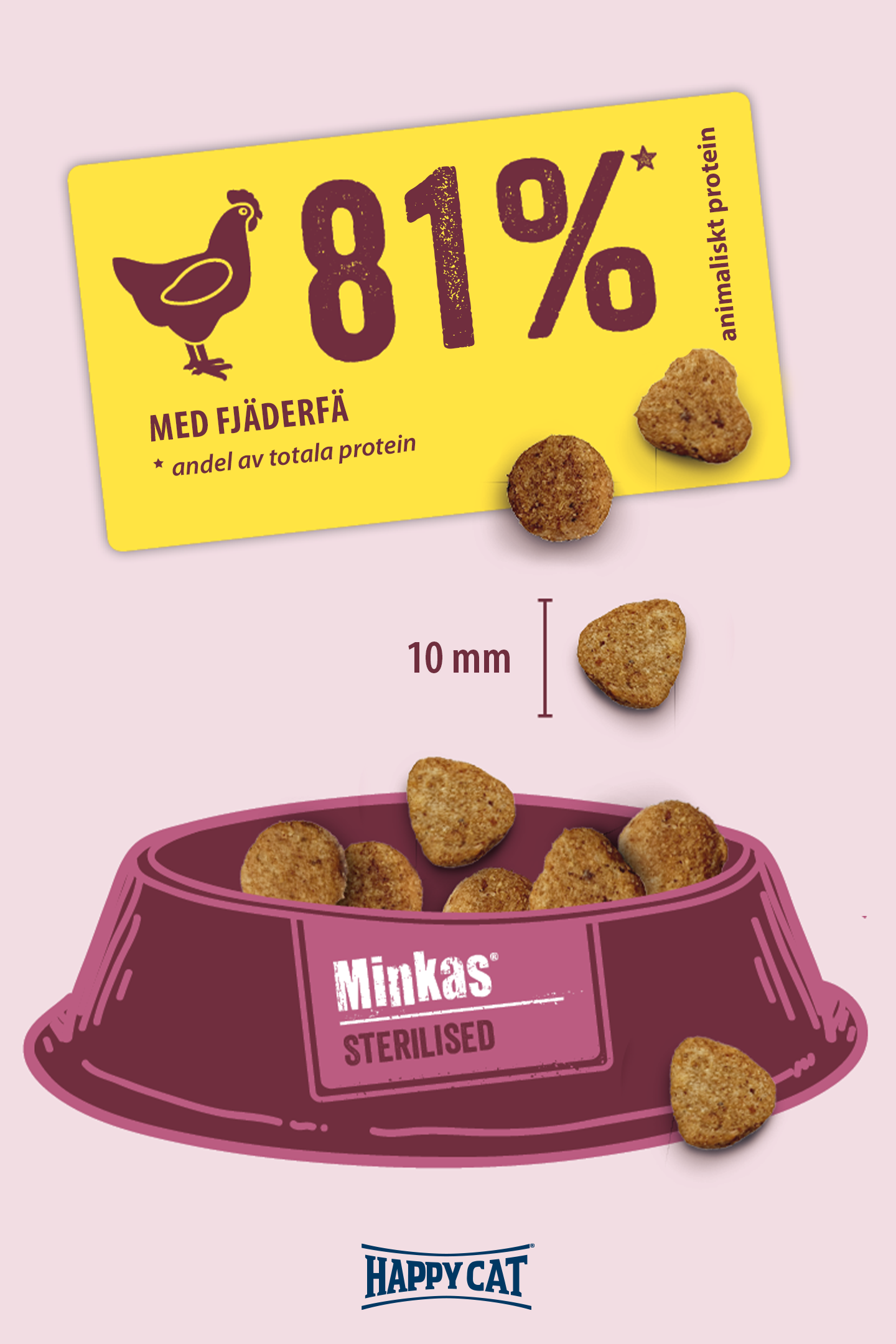 Naturligtvis är våra recept fria från artificiella smakämnen och konserveringsmedel. Skäm bort din katt med vårt Minkas Sterilised Fågel, ett foder med fyllig och rik smak. Det är dessutom rikt på omega-3- och omega-6-fettsyror som främjar hud och päls.