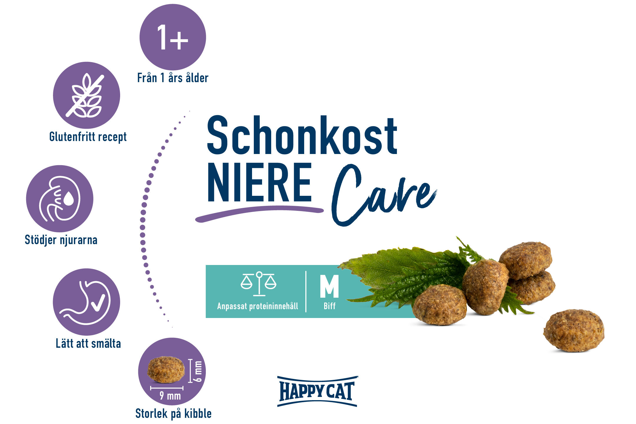 Happy Cat Sensitive Care Schonkost Niere (Njure) är särskilt lämplig för matning av katter i de tidiga stadierna av njursvikt. Njursvikt innebär att njurens funktion har begränsats och att njuren inte längre kan fullgöra sina uppgifter till fullo.