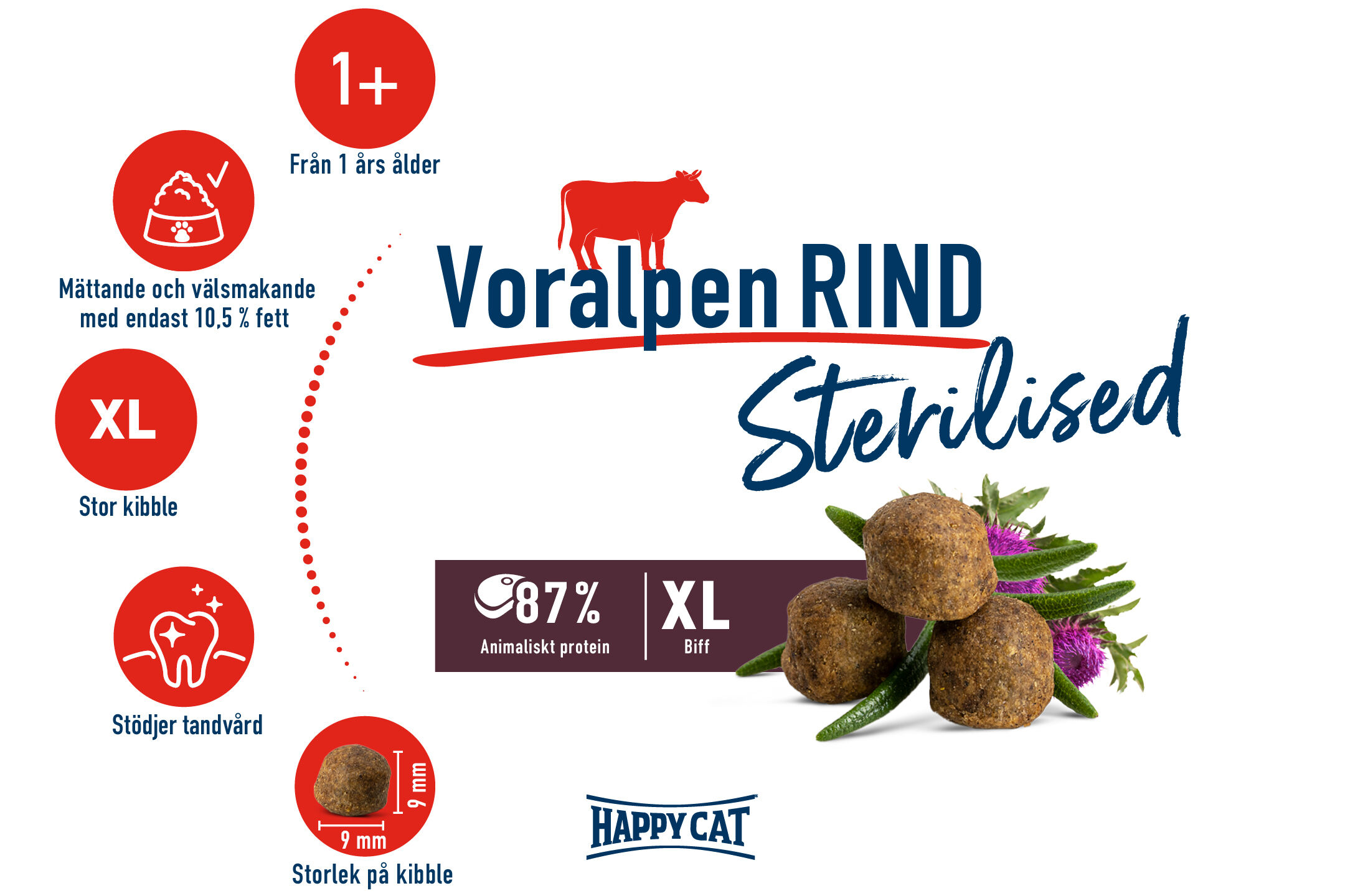 Vårt Sterilised Pre-Alpine Beef torrfoder är tillverkat i ca 9 x 9 mm stora kroketter. De stora kroketterna ger en större nötningsyta och kan därför förebygga tandsten hos katter. Från vårt steriliserade sortiment erbjuder Voralpen-Rind de största kroketterna i storlek XL; de andra två sorterna i det steriliserade sortimentet levereras i storlek M (ca 6 x 9 mm). Du kan också hitta användbar information om tandvård för katter i vår kattguide.