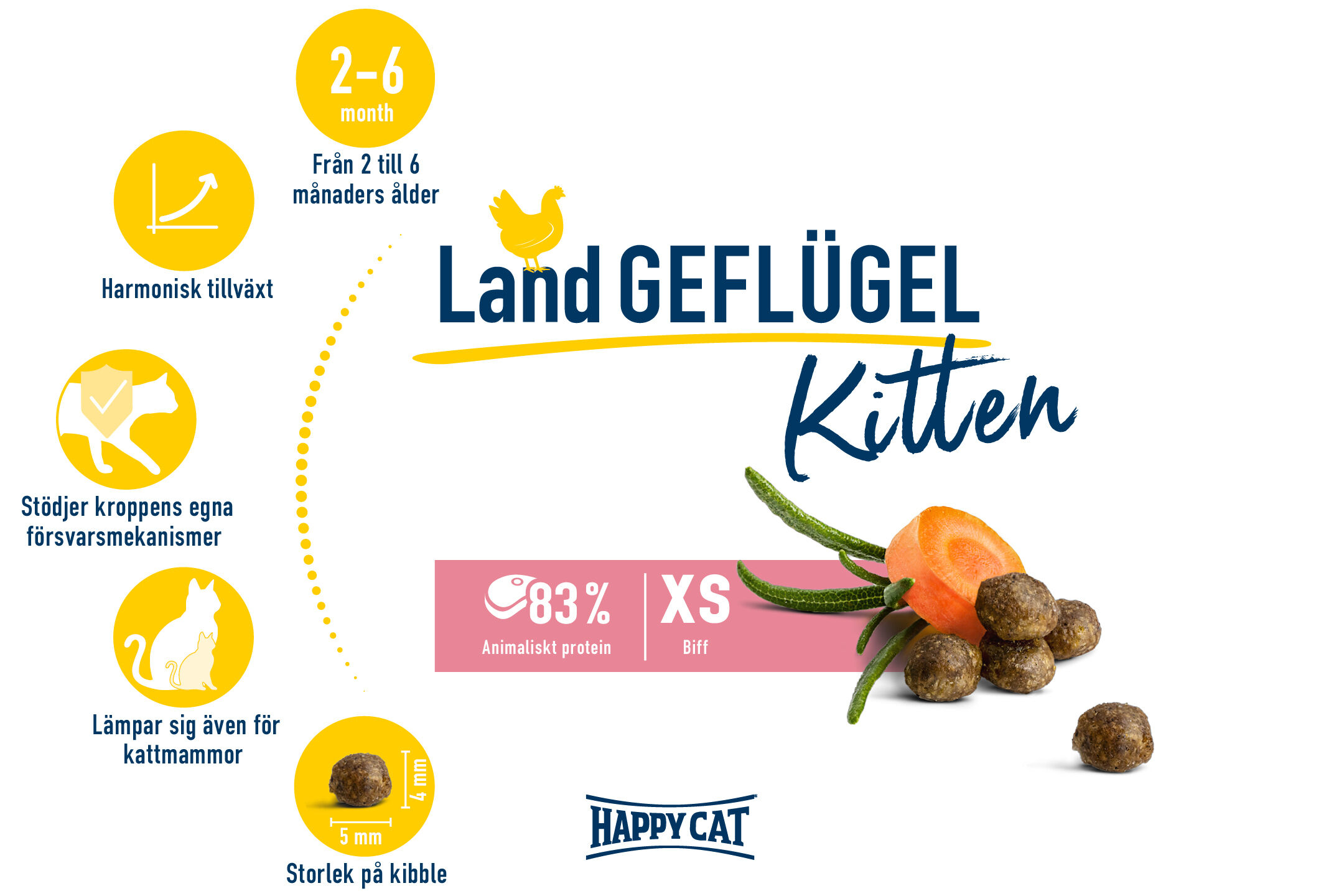 Happy Cat Kitten Country Poultry består av lättsmält fjäderfä, välsmakande morötter och fin rosmarin. De högkvalitativa proteinerna från fjäderfä behövs för att muskuloskeletala systemet ska kunna utvecklas optimalt. Det tillsatta C-vitaminet stöder också kroppens eget försvar. Vårt kattungefoder innehåller allt som din kattunge behöver för en harmonisk tillväxt och främjar dessutom kroppens eget försvar. Så att din kattunge kan upptäcka världen på ett hälsosamt och livligt sätt!