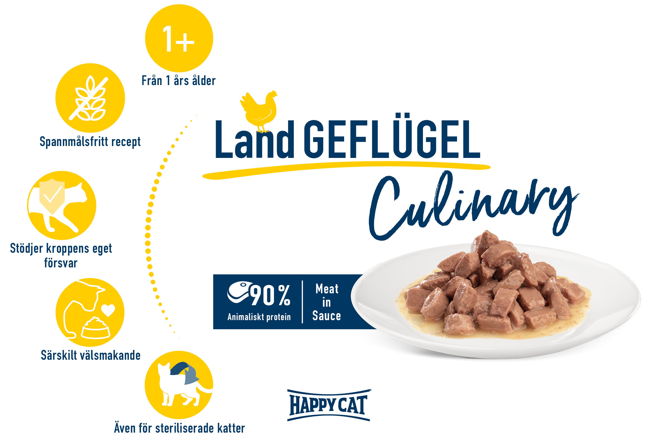 Ett kvalitativt våtfoder för katter med hög kötthalt förser inte bara din katt med alla de näringsämnen den behöver för en artanpassad diet. Vår våtfodersort Happy Cat Meat in Sauce Culinary Farm Poultry (Fågel) har även en positiv inverkan på kattens vätskebalans. Det saftiga fågelköttet stödjer även kroppens naturliga försvar.